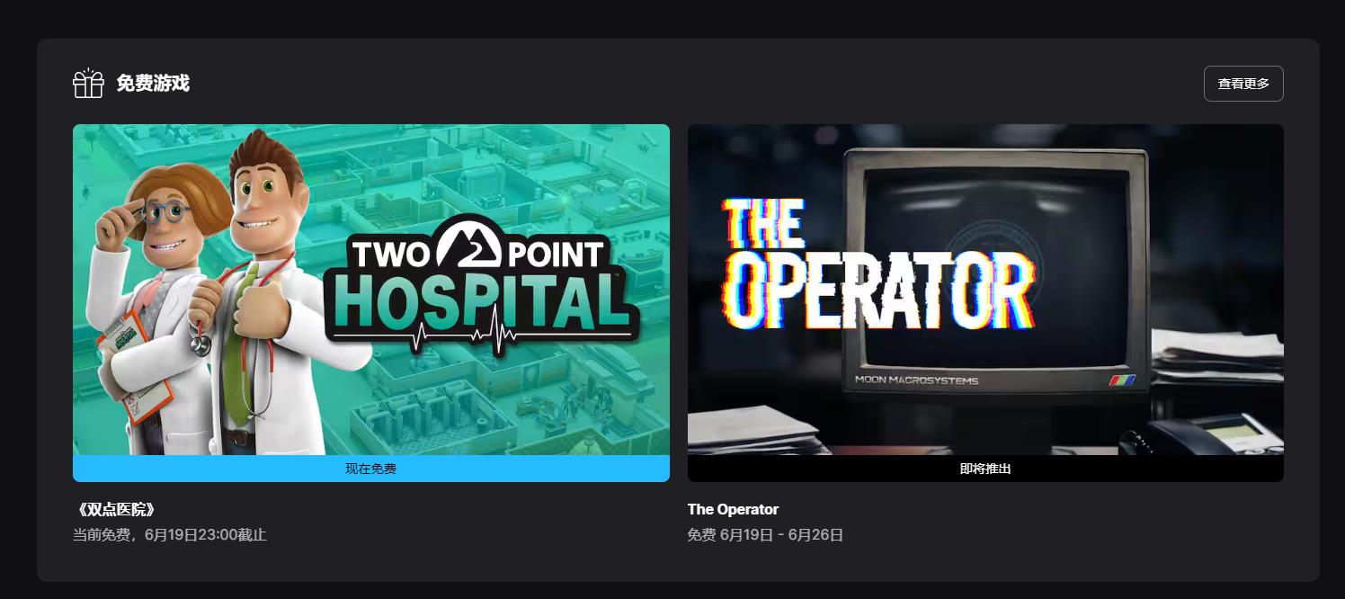 【Epic喜+1】模拟游戏《双点医院》已可在Epic商店中免费领取,领取后永久入库,截止时间到6月19日23:00。下周免费游戏为《The Operator》。