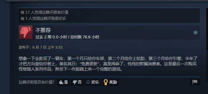 《怪物猎人:荒野》Steam近期评价暴跌至"多半差评" 更新补丁反致性能恶化