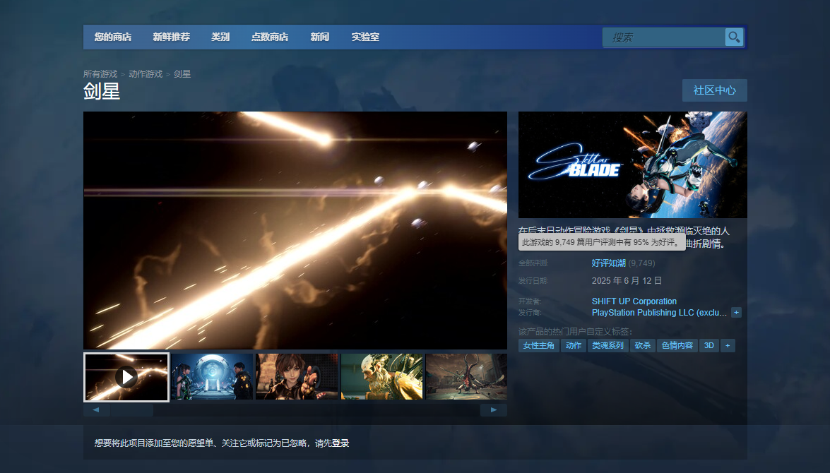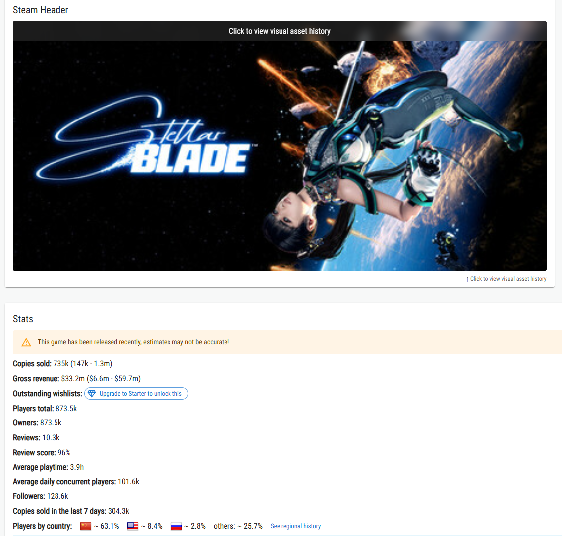 【数据统计显示《剑星》约6成玩家来自中国】第三方网站Gamalytic数据统计显示,《剑星》PC版的近6成的玩家来自中国,紧随其后的是美国玩家,占比约为8.4%,第三位是俄罗斯约2.8%。《剑星》PC版自发布以来受到了玩家广泛欢迎,根据SteamDB数据,游戏近日的玩家峰值接近20万。目前《剑星》在Steam收到9749份评价,其中95%为好评,总体评价为好评如潮。