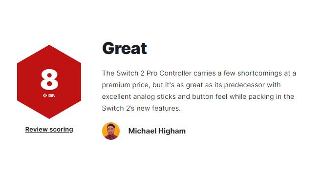 【NS2 Pro手柄获IGN 8分评价】游戏媒体IGN(总部)在今日发表的Switch 2 Pro手柄评测中为这款新产品打出了8分。评测者认为NS2 Pro手柄作为第一方旗舰控制器,整体感觉良好。它继承了前代的优点,并提供了背键、C键、3.5mm音频接口等功能。手柄的材质与按键手感令人满意,续航也基本和前代持平。