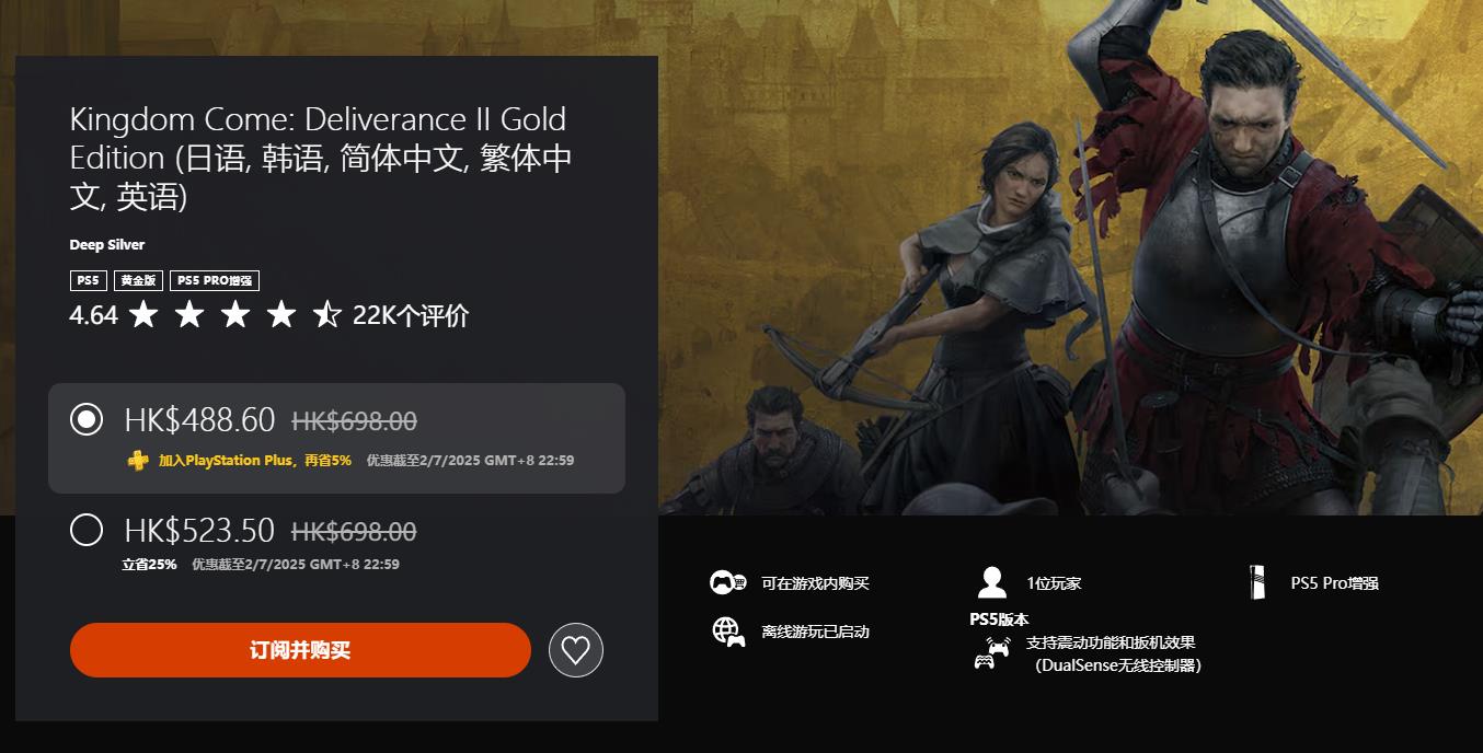 《天国:拯救2》黄金版488HKD(新史低/需要PS+)