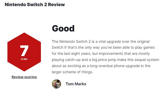 【IGN总部为任天堂新机Switch2打出7分评价】IGN总部今日发表了Nintendo Switch 2的评测报告。该媒体认为这款新机虽带来了重要的升级,但整体缺乏创意,最终给予了7分评价。