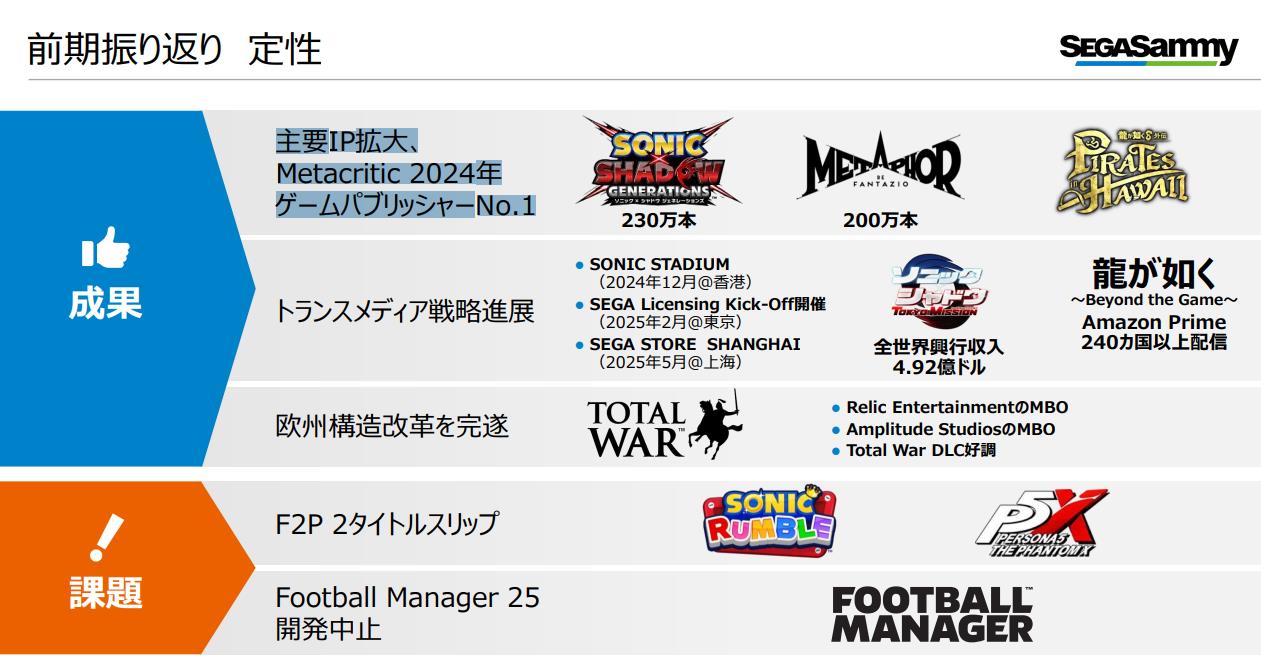 【《暗喻幻想:ReFantazio》累计销量达200万份】世嘉在近日公布的管理会议报告中确认,于去年10月推出幻想RPG新作《暗喻幻想:ReFantazio》全球累计销量现已达到200万份。此外,同样于去年上市的《索尼克x夏特:世代重启》也取得了不错的成绩,目前销量超过了230万份。值得一提的是,这两款游戏均在发售首日,就成功达成了百万销量的里程碑。