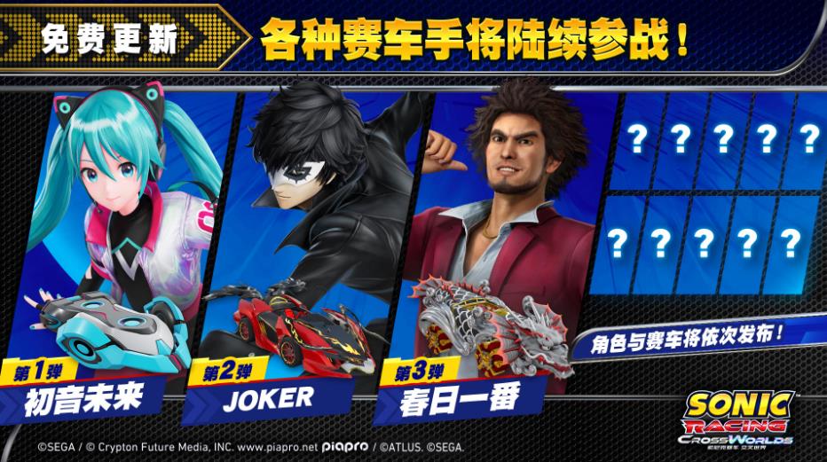 《索尼克赛车:交叉世界》预计于9月25日登陆PS5/PS4/Xbox Series/Xbox One/NS/NS2/PC。除上述联动内容外,目前已知的免费的联动赛车手有“初音未来”“Joker”“春日一番”。