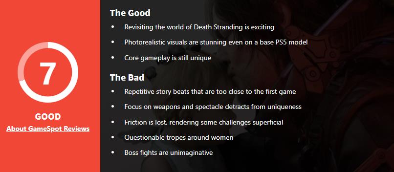 GameSpot: 《死亡搁浅2》是一款好作品,但非杰出续作。游戏的画面表现较为惊艳,核心玩法依旧独特。但强调战斗的转变与前作送货的理念冲突,故事慢热且给人以重复感。并且,本作对女性的描绘存在糟糕的刻板印象。