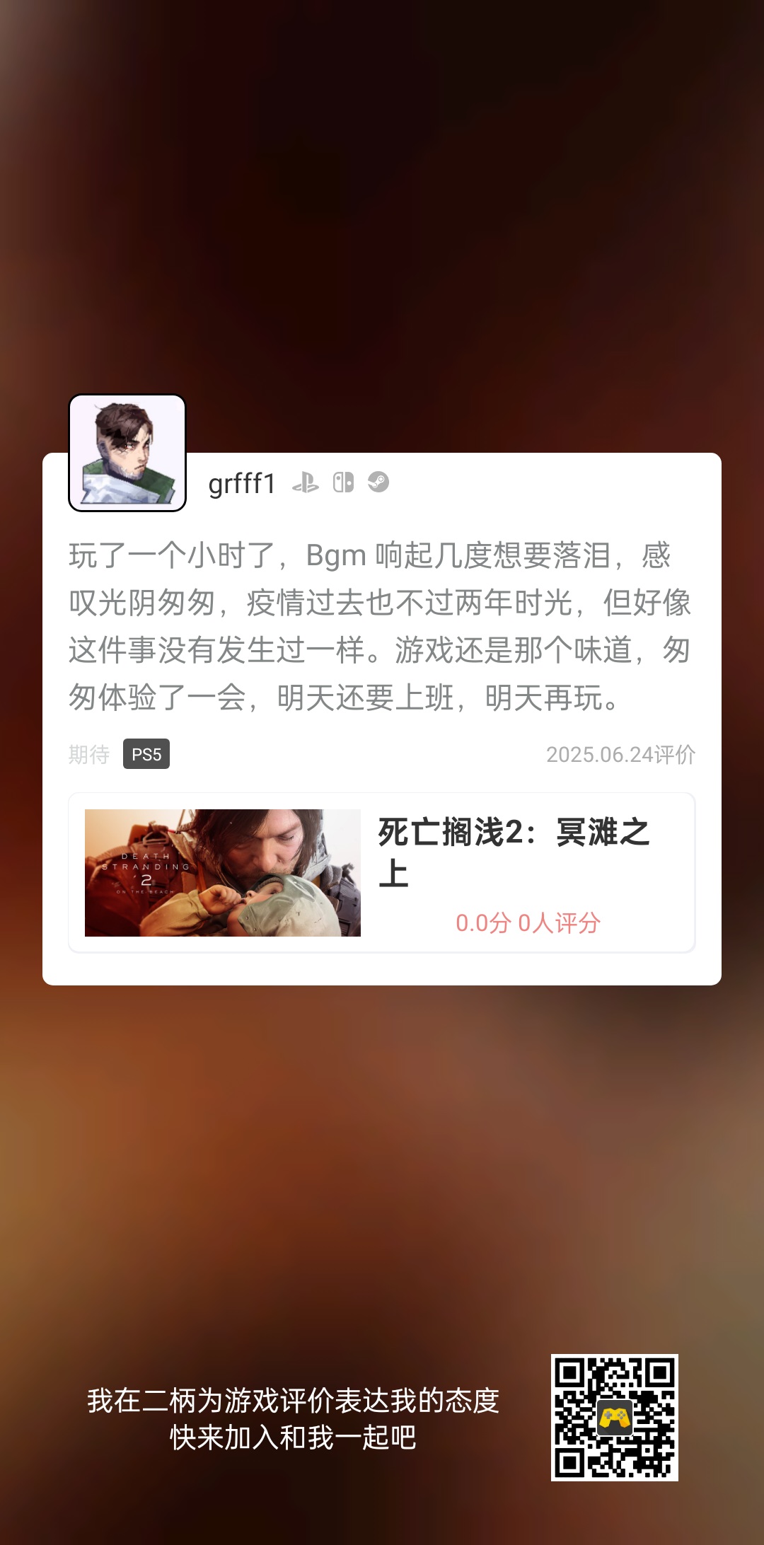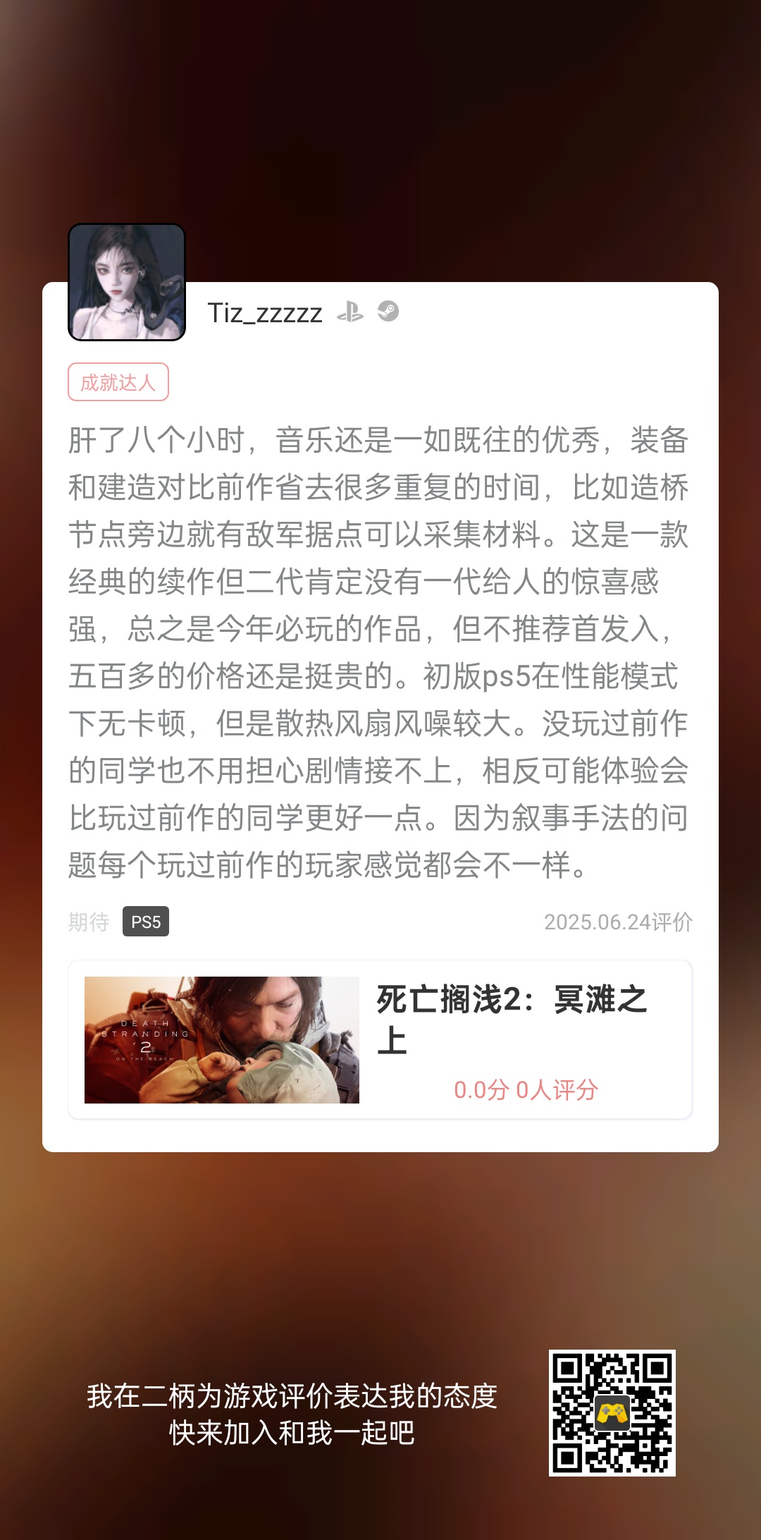 【欢迎给《死亡搁浅2》写下游玩评价】《死亡搁浅2:冥滩之上》豪华版已提前48小时解锁,我们关注到部分二柄玩家已在游戏详情页写下游玩体验,欢迎已体验的玩家给游戏打分并评价,聊聊游戏的画质表现、音乐叙事、“送货”玩法与“连接”哲学是上一代作品又有哪些提升与改变等等。 发布评价的方式: 点击此条资讯ICON->游戏详情->发布评价即可分享游玩体验(评价中请不要剧透)