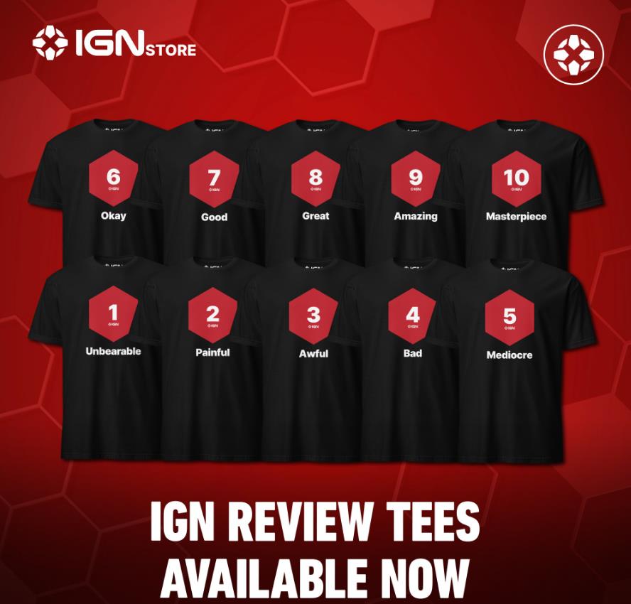【穿上你的“吐槽”!IGN推出经典评分T恤】海外游戏媒体IGN在其商店中上架了以其游戏“评分”为主题设计的T恤。官方表示:“这个经典的六边形,经常被模仿,从未被复制,偶尔也会被当成梗来使用。既然这么渴望它,那么就如大家所愿!现在你有机会自豪地(或痛苦地)将IGN和电子游戏历史的一小部分穿在身上。”该T恤每款售价27.5美元(约198元),1~10分全套购入还可享受九折优惠!不知大家中意几分T恤呢?