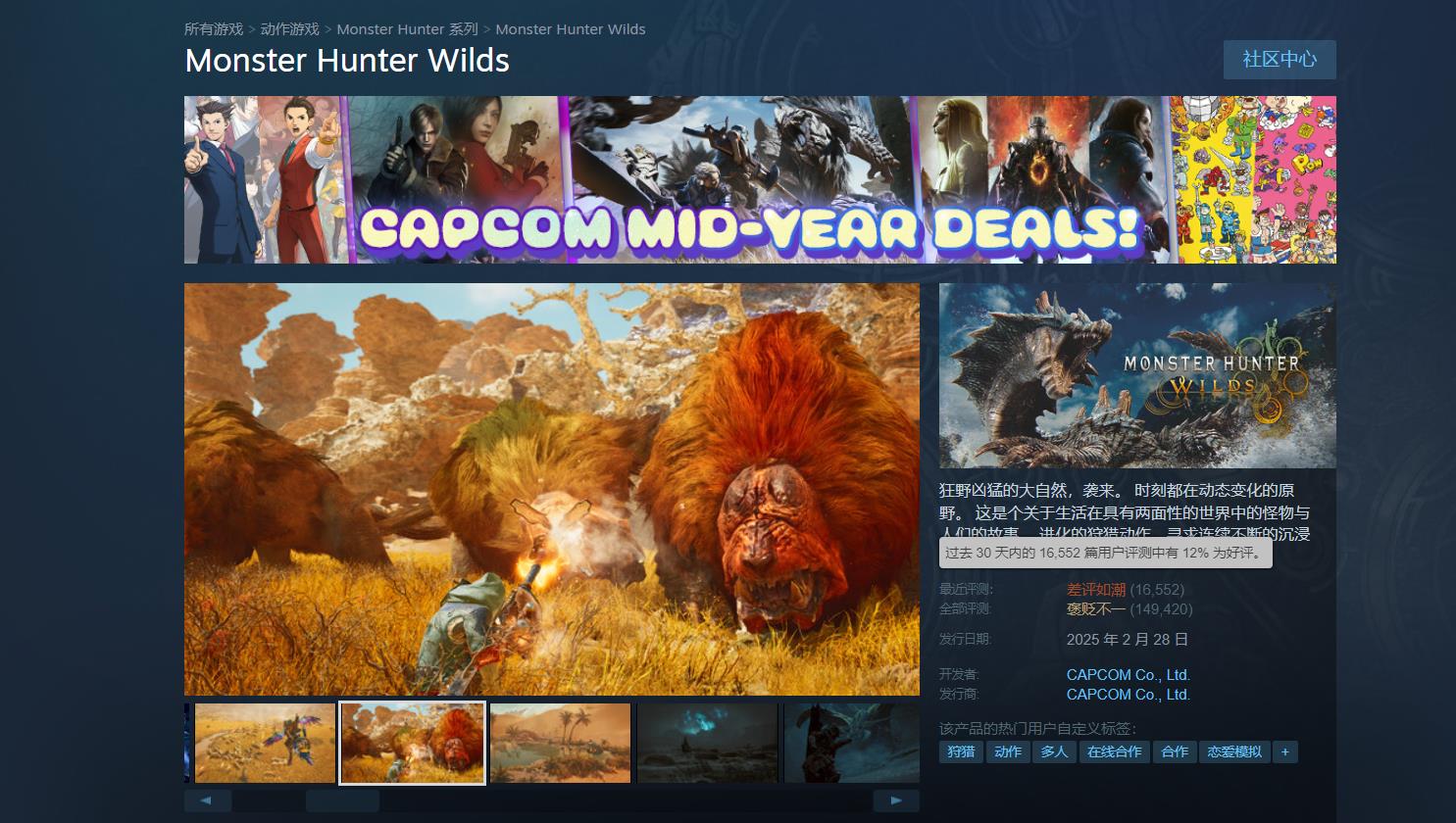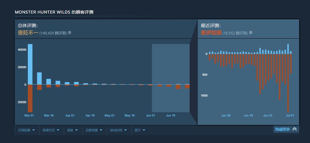 《怪物猎人:荒野》Steam最近好评率跌至12%