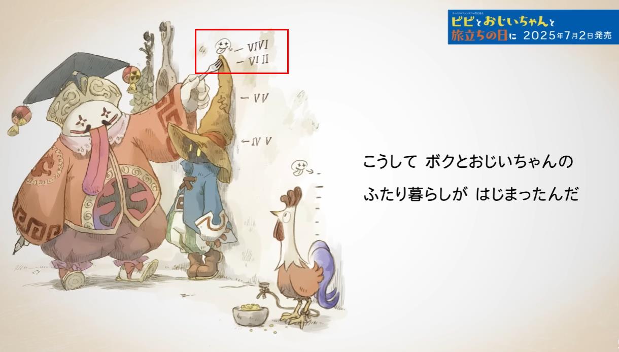 【《最终幻想9》人气角色“比比”的名字或来自于身高】为纪念《最终幻想9》25周年,SE带来了以人气角色“比比”为主人公的绘本《比比与爷爷的启程之日》。在官方预告视频里,我们或许可以了解到比比名字的由来。在一页的绘图中,比比踮着脚勉强达到了“VIVI”,这不仅与其名字相同,还和本作的标题序号相契合。