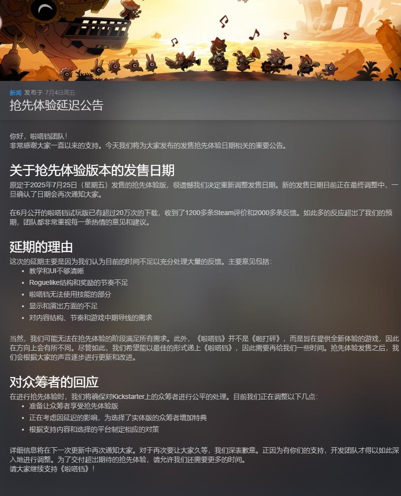 【《啪嗒砰》精神续作《啦嗒铛》抢先体验版延期上线】《啦嗒铛》官方今日宣布了游戏延期推出的消息。本作原定于2025年7月25日发布抢先体验版,目前新上线日期还在最终调整中,确认后会再次进行通知。据悉,此次跳票的理由是需要更多的时间来处理玩家们的反馈内容,包括:教学和UI不够清晰、Roguelike结构和奖励的节奏不足、啦嗒铛无法使用技能的部分、显示和演出方面的不足、对内容结构以及节奏和游戏中期导线的需求。