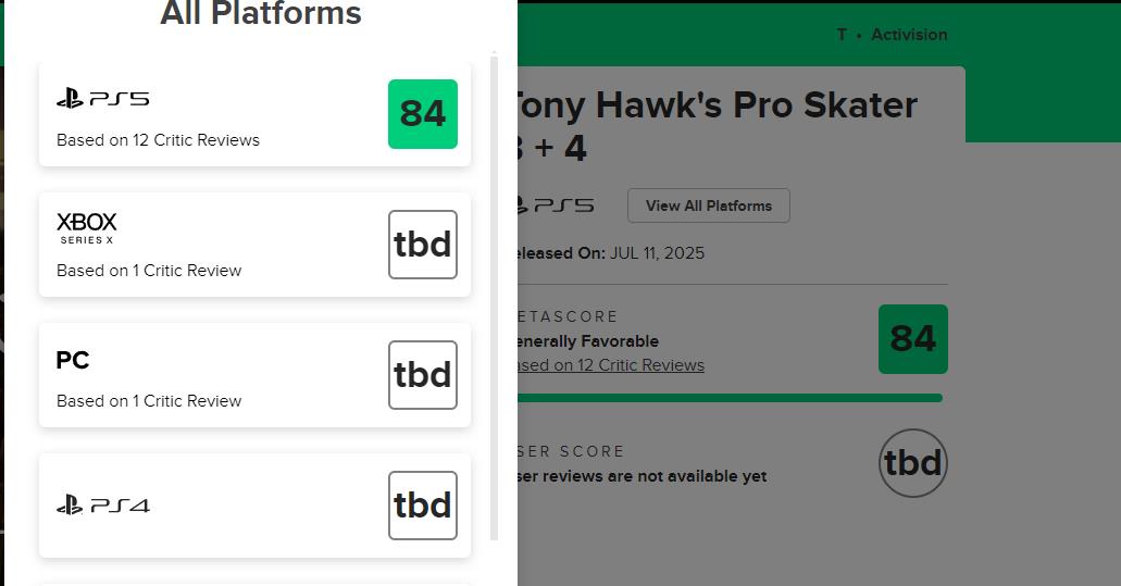 《托尼霍克职业滑板3+4》MC评分84,获IGN和GS双8分评价