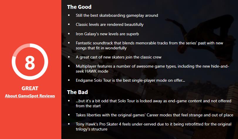 GS:本作依旧是当下最好的滑板游戏!它拥有着优秀的手感和进化的画面,新内容也带来了足够多的乐趣。不过部分对原版内容的改动有点令人不适。