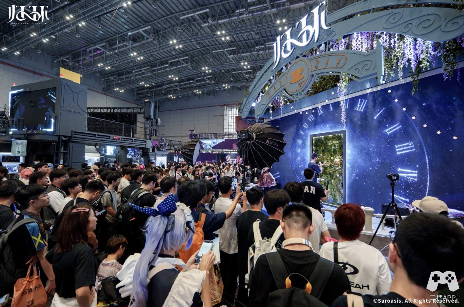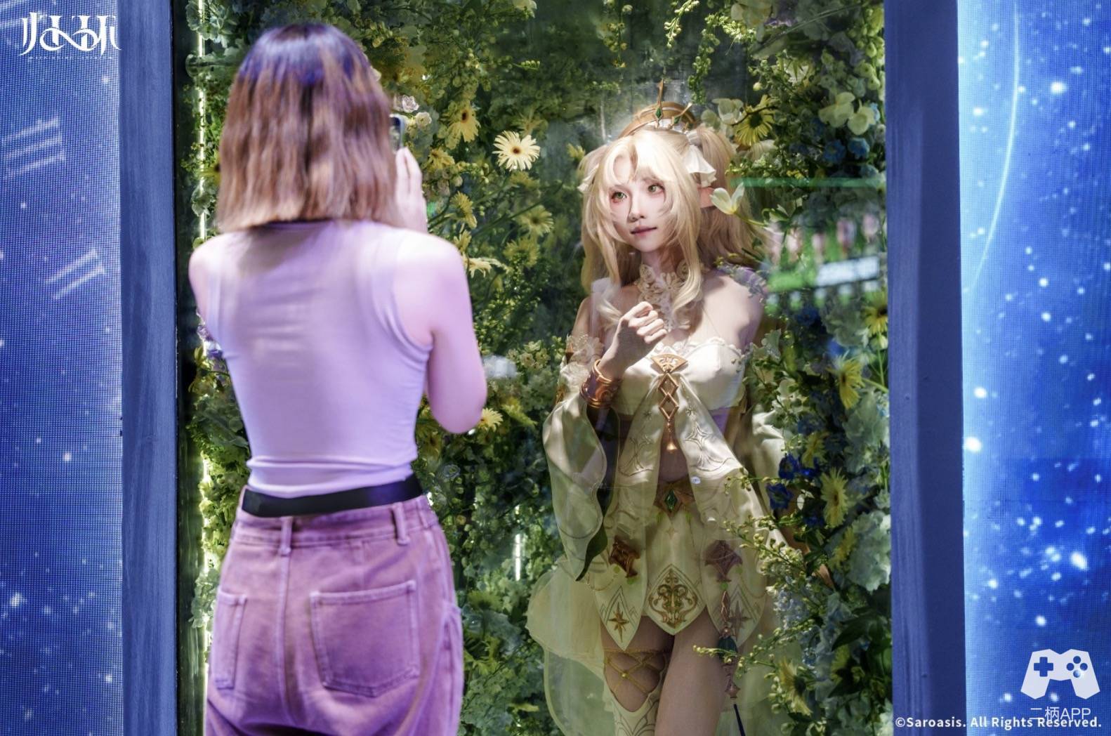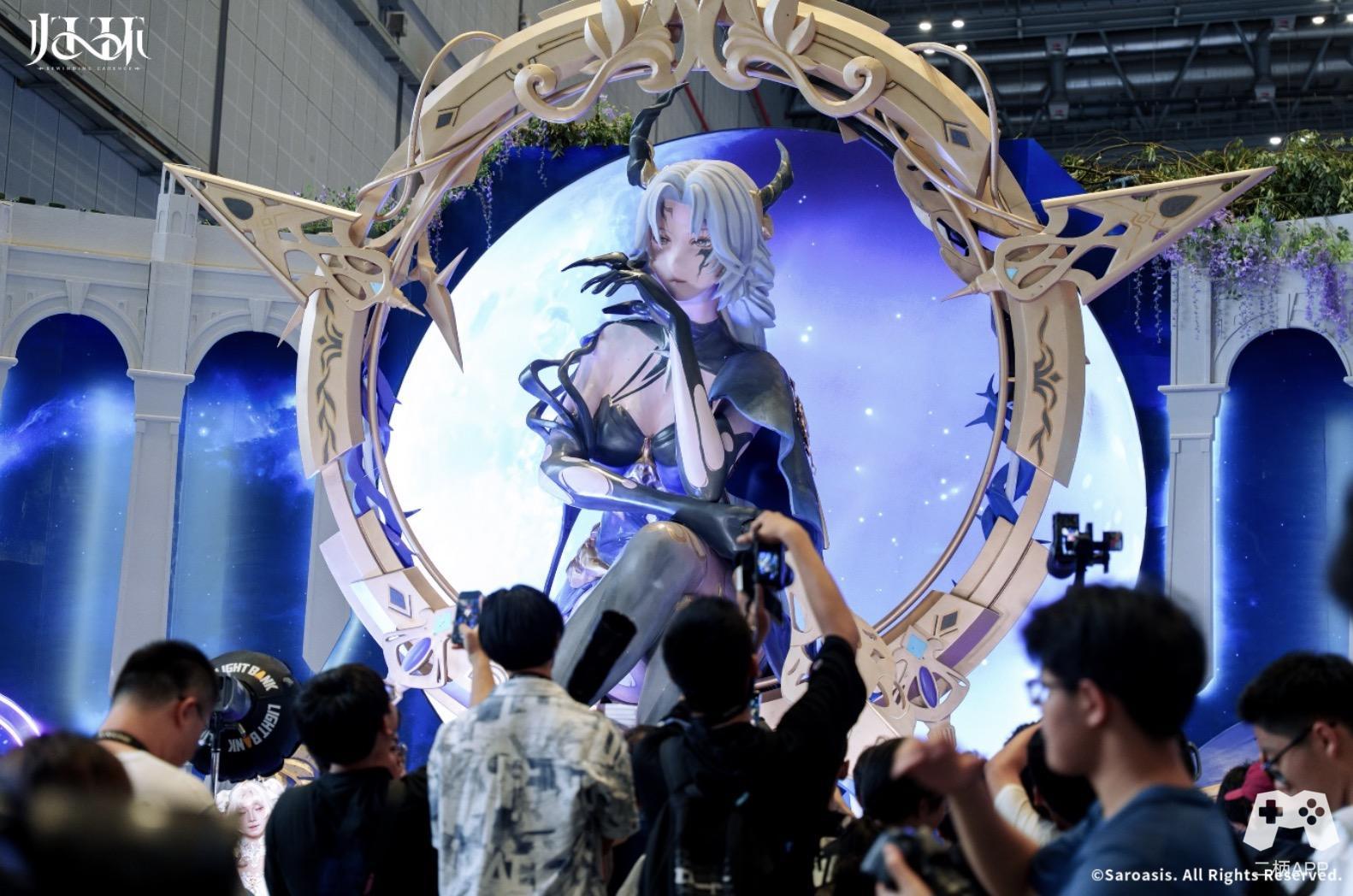 高达数米的“达芙涅巨物雕塑”无疑是展区的绝对焦点——细腻的纹理雕刻从底座延伸至顶端,金属与柔光 的碰撞勾勒出极具冲击力的视觉轮廓,每一处细节都彰显着搭建的匠心与恢弘,达芙涅大长腿交叉,以女王之态俯 瞰整个会场,远远望去便足以让人驻足惊叹,唤醒了刚参与完试玩的玩家被 BOSS 支配的恐惧。而一旁的洛伦花店 展区则以极致精致与之呼应:数千支仿真花材搭建出立体花墙,藤蔓缠绕的拱门缀满晶莹露珠,暖黄灯光透过花瓣 洒下斑驳光影,随手一拍皆是梦幻大片,将“豪华”二字融入每一寸场景设计。