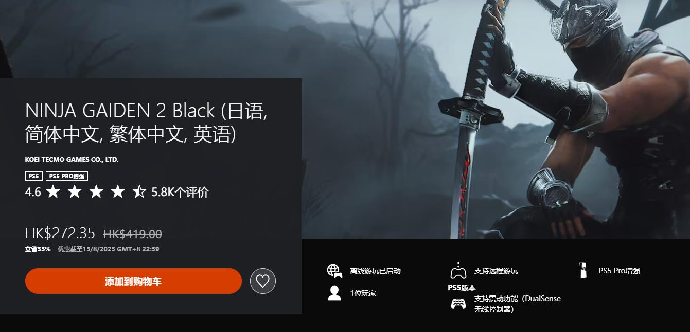 《忍者龙剑传2黑之章》272.35HKD(新史低)