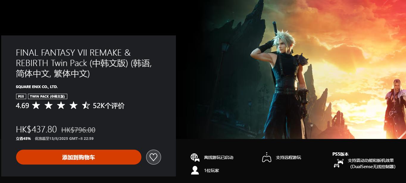 《最终幻想7重制版+重生》437.8HKD(新史低)