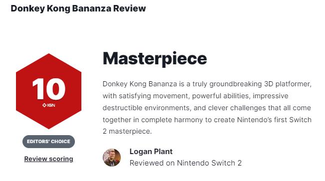 IGN:《咚奇刚:蕉力全开》既是《奥德赛》续作,也是任天堂经典角色咚奇刚的精彩回归。游戏大胆的创新带来了高自由度的破坏机制、爽快的操作手感、层层推进的解谜设计和充满探索乐趣的世界,构成了一场突破性的冒险旅程。20小时的主线流程惊喜不断,通关后还有大量可玩内容。各要素巧妙融合,成就了NS2平台上任天堂的首部杰作。