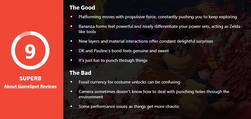 GS:任天堂用这款游戏重新定义了咚奇刚这一经典角色!游戏继承了《奥德赛》的核心又融合了环境破坏玩法。剧情上,咚奇刚与宝琳之间的感情真挚而甜蜜。不过破坏地形时偶尔视角上存在些问题,并且后期复杂环境下容易掉帧。总的来说游戏素质很高,可与《奥德赛》等任天堂近年最佳作品并列。