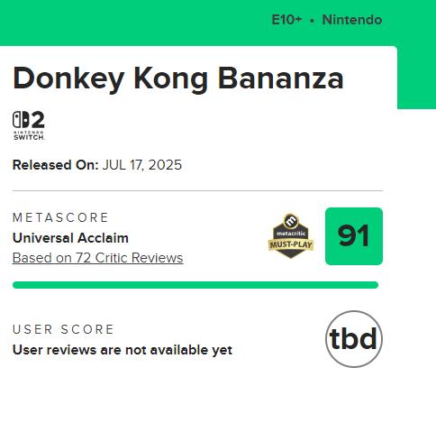 《咚奇刚:蕉力全开》MC均分90,获IGN满分,GS9分评价