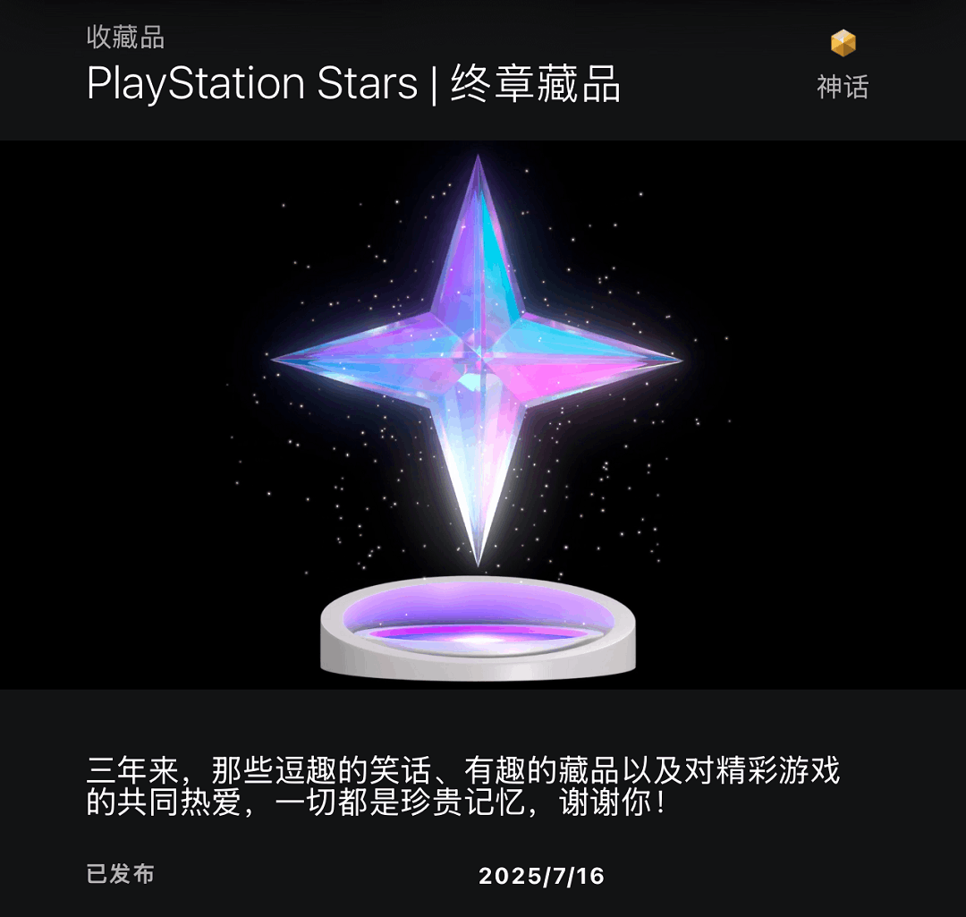 【PS Stars最后一个收藏品“终章藏品”上线】PlayStation Stars的最后一个收藏品“终章藏品”现已上线。官方在说明中写道:“PS Stars即将说再见,你的一路支持,我们将永远铭记于心。三年来,无论是精彩游戏、有趣挑战,还是激动人心的数字藏品,一切皆是珍贵回忆!”