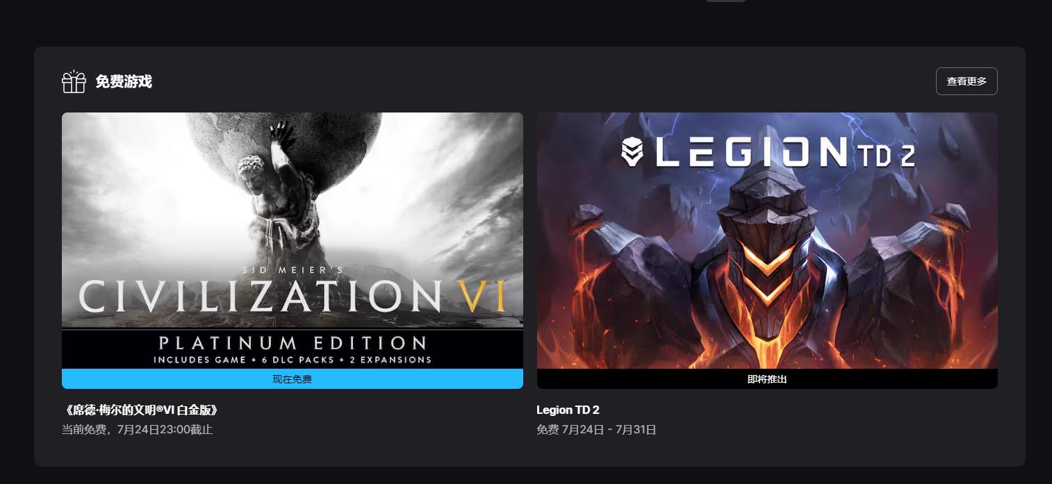 【Epic喜+1】策略游戏《文明6》白金版已可在Epic商店中免费领取,领取后永久入库,截止时间到7月24日23:00。下周免费游戏为《军团战争2(Legion TD 2)》。