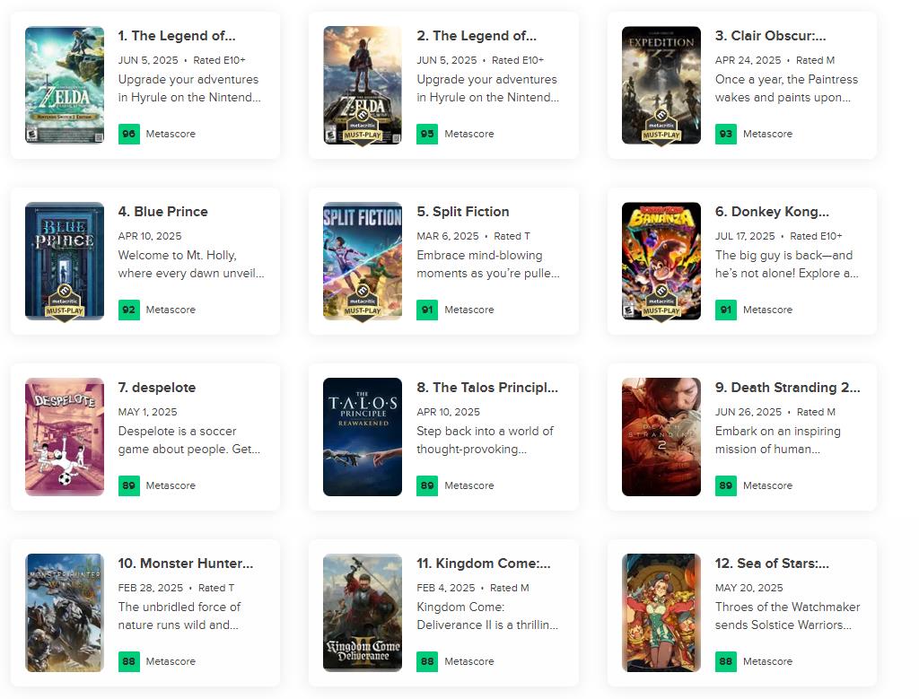 【《咚奇刚:蕉力全开》以91分的成绩跻身今年MC高分榜前五】任天堂新作《咚奇刚:蕉力全开》现已在NS2上推出。目前本作在评分聚合网站Metacritic上的媒体均分为91,与《双影奇境》并列为2025年高分游戏榜第5位。若排除NS2版《塞尔达传说:旷野之息/王国之泪》等非新作项目的话,其排名还要再上升两位。目前TOP 10名单如下: