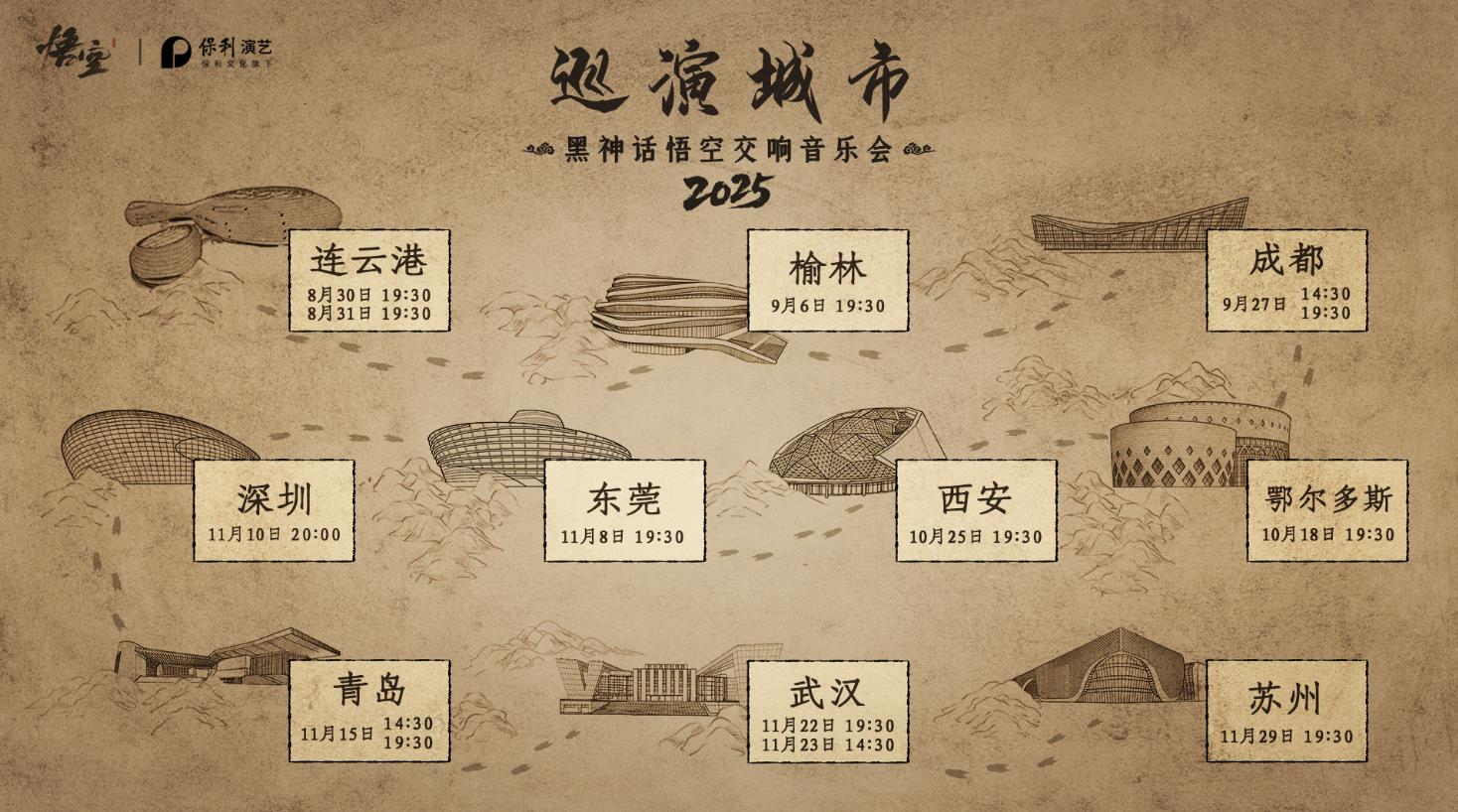 【《黑神话:悟空》音乐会2025巡演现已开票】由《黑神话:悟空》与保利演艺联合出品的“黑神话悟空交响音乐会”2025巡演现已开票。购票平台为保利票务|猫眼|大麦。本次巡演将于2025年8月30日-11月29日登陆连云港、榆林、鄂尔多斯、成都、西安、东莞、深圳、青岛、武汉、苏州等城市。具体安排详见附图。