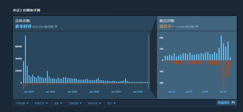 【《命运2》新资料片首日Steam玩家在线峰值人数破历史新低】《命运2》最新资料片《宿命边缘》已于本周上线。但其首日在Steam上的同时在线玩家峰值人数只有99193,创系列资料片发布历史最低纪录。该数字低于《凌光之刻》的24万和《终焉之形》的30万,也不及免费更新《进入光能》的12.2万。媒体PC Gamer认为游戏人气走低的主因是多年运营积弊的爆发,包括付费内容的删除以及工作室裁员等问题。目前《命运2》Steam上的过去30天玩家评价“褒贬不一”,好评率为57%。