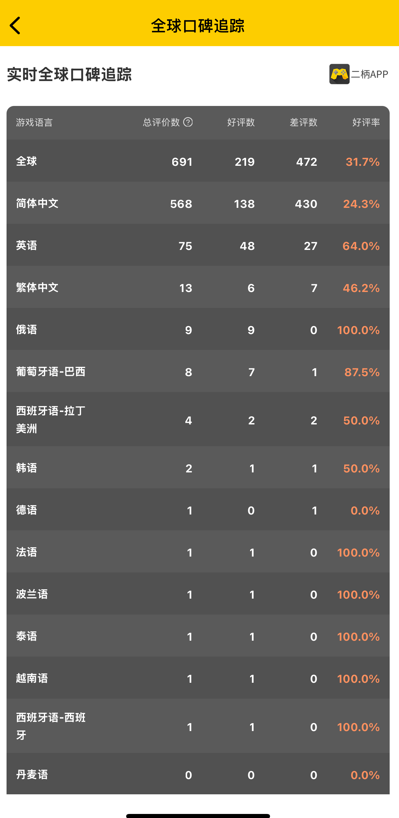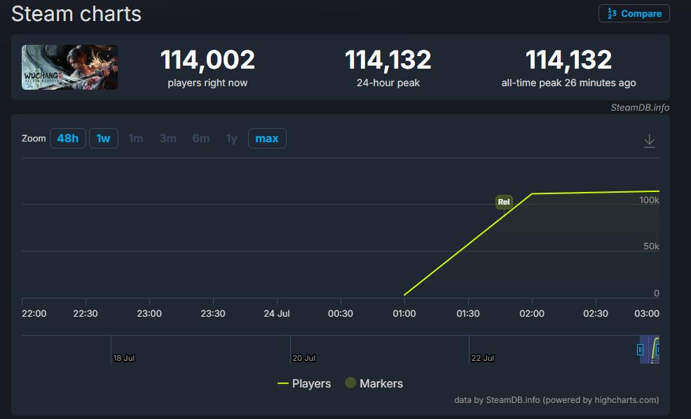 根据SteamDB显示,本作上线仅一个小时Steam玩家峰值数就达到了114132人,预计接下来还会进一步增长。柄友们也可在我们的APP《明末:渊虚之羽》详情页面中点击“全球口碑追踪”来查看本作在世界各地的实时评价数据。需要注意,目前游戏刚刚发售,Steam玩家好评率数据存在巨大波动,相关内容仅作参考。