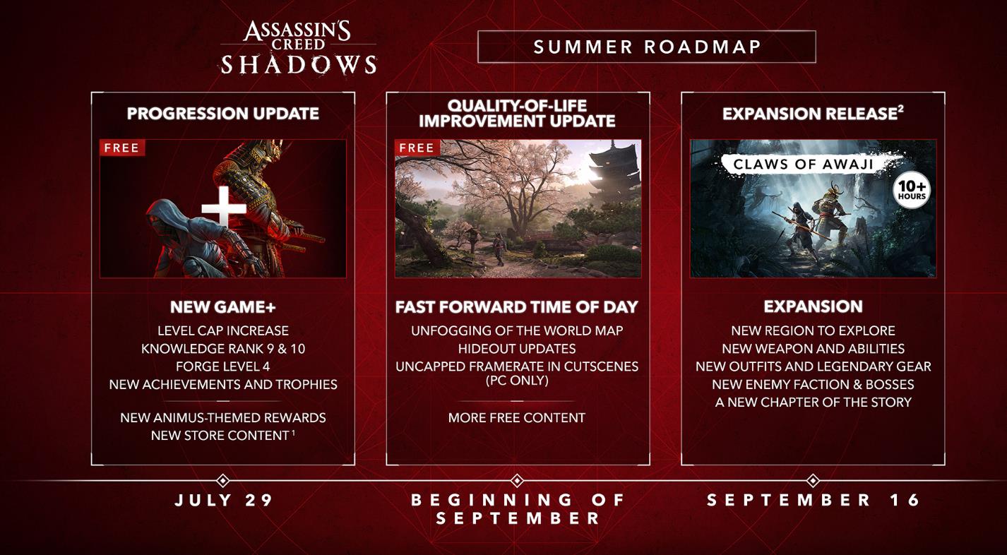 【《刺客信条:影》夏季更新路线公开:新游戏+月底推出】育碧公布了《刺客信条:影》夏季更新路线图: 7月29日:新游戏+、进度更新(等级上限提高至80等)。 9月初:游戏整体品质更新,包括时间跳过、全新铁匠铺等级等内容。 9月16日:DLC“淡路之爪”上线(需完成主线解锁)。
