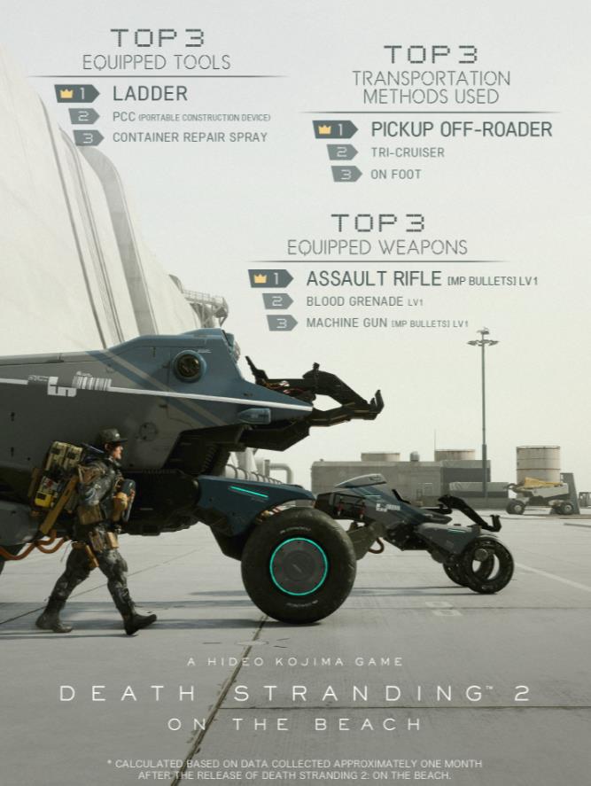 【《死亡搁浅2》上市一个月!官方分享玩家数据】为纪念《死亡搁浅2:冥滩之上》上市一个月,小岛工作室今日分享了本作的一些玩家数据: