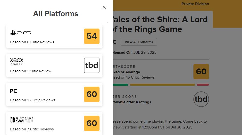 【《指环王:夏尔传说》MC均分60,获IGN 4 分评价】生活模拟游戏《指环王:夏尔传说》全球媒体评分现已解禁。截至目前本作在MC上PC版均分60(暂由16家给出)、PS5版54(暂由6家给出)、NS版60(暂由7家给出)。其中IGN为本作打出4分评价,该媒体认为游戏整体表现令人失望。其机制浅薄,重复性高。技术问题严重,性能糟糕,最终未能发挥IP的潜力。
