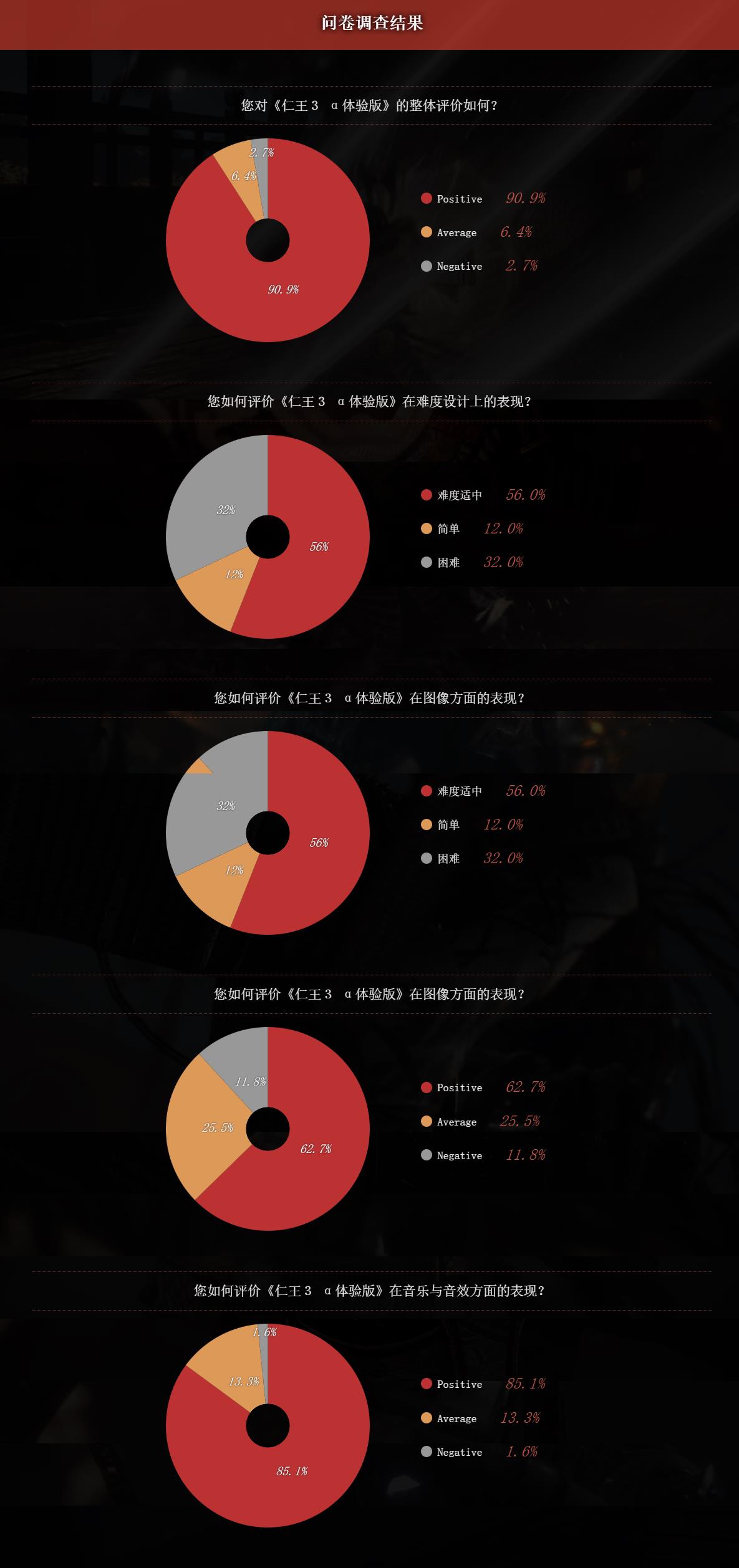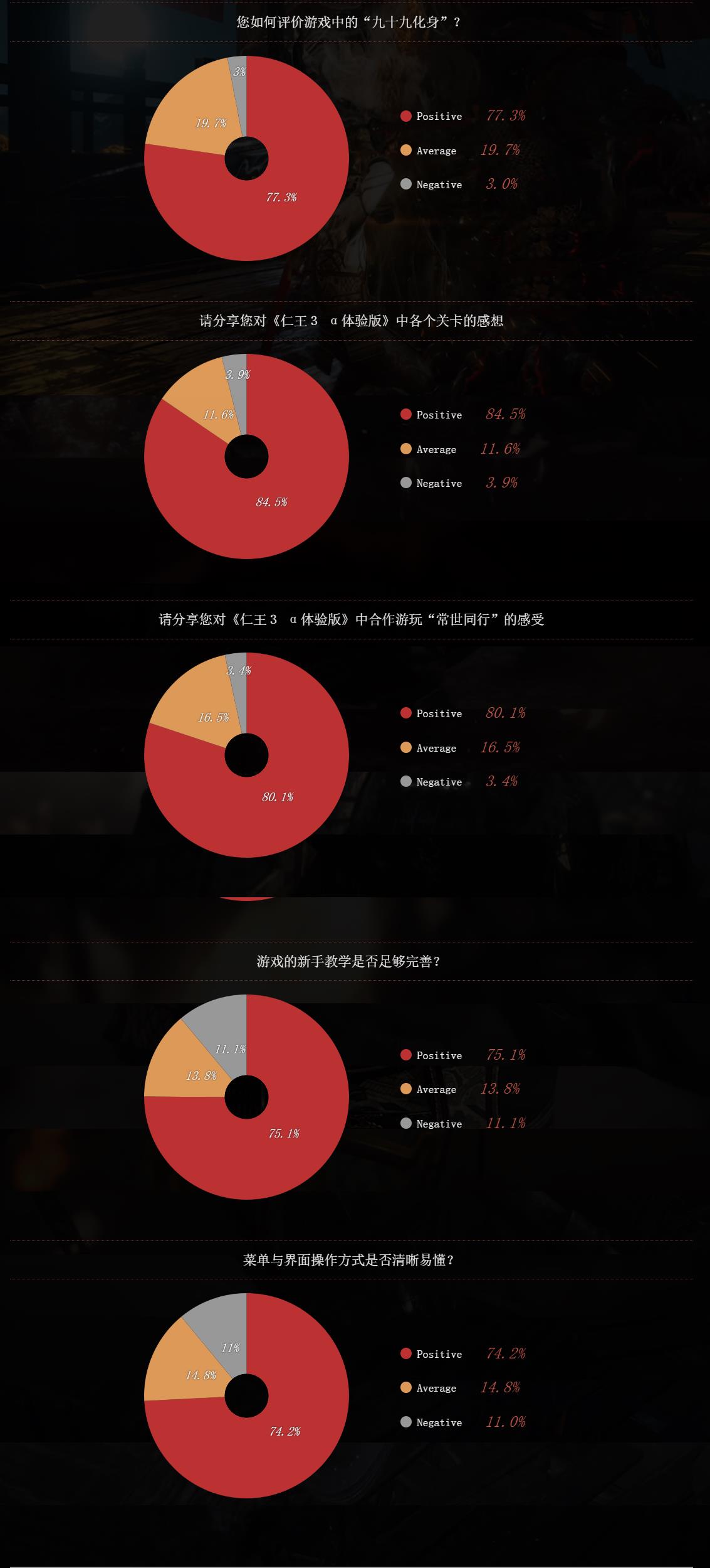 【《仁王3》问卷调查结果与调整优化方向报告公开】光荣特库摩今日公布了新作《仁王3》α体验版的玩家问卷调查结果和调整优化方向报告。据悉粉丝们对此次体验版整体反馈较好,90.9%的玩家给予了积极的评价。56.0%的人认为难度适中、75.1%的人觉得新手教学足够完善。