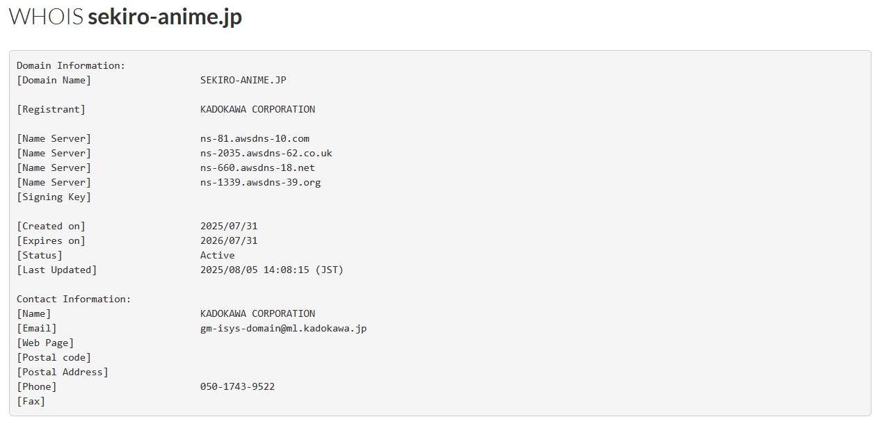 【角川为《只狼》动画注册域名】近日有玩家发现角川于7月末为《只狼》动画注册了域名(sekiro-anime.jp)并在本月5号进行了更新。目前有关该这款作品的细节信息还尚不明确,具体还需要等待官方的正式公布。 值得一提的是,此前海外知名“舅舅”Oecuf曾爆料过《只狼》和《对马之魂》游改动画项目存在的消息,其中后者已经被确认。据其透露,《只狼》动画会由日本工作室Qzil.la制作。
