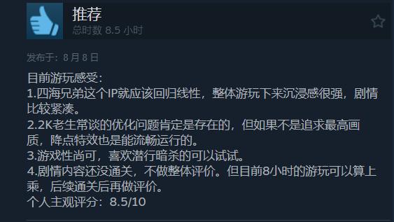 《四海兄弟:故乡》Steam上获玩家“特别好评”