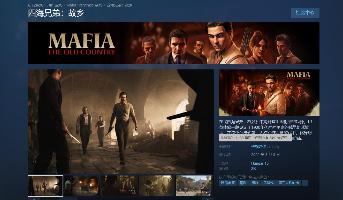 【《四海兄弟:故乡》Steam上获玩家“特别好评”】《四海兄弟》系列最新作《四海兄弟:故乡》已于今日正式发售。截至目前,本作在Steam上已有1139条玩家评论,好评率84%,整体为“特别好评”。国区101篇,好评率70%。大部分玩家对游戏回归线性这一设计给予了肯定,不过现阶段在优化方面上似乎还存在一些问题。