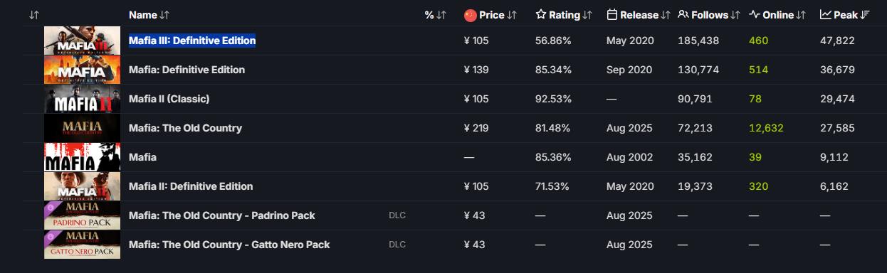 《四海兄弟:故乡》在Steam上的首日玩家峰值数为27585,与系列最高的《四海兄弟3》(47822)相比还有一点距离。本作Steam国区售价219元,支持中文。