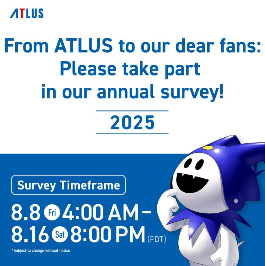 【Atlus调查玩家对《暗喻幻想》续作及《女神异闻录》衍生作兴趣】Atlus近日发布了每年例行的玩家调查问卷活动。其中包括:是否对《暗喻幻想:ReFantazio》续作感兴趣、还期待哪些类型的《女神异闻录》衍生作等问题。对于后者,官方提供了如类魂、肉鸽、银河城、恋爱模拟、无双、多人在线等选项。