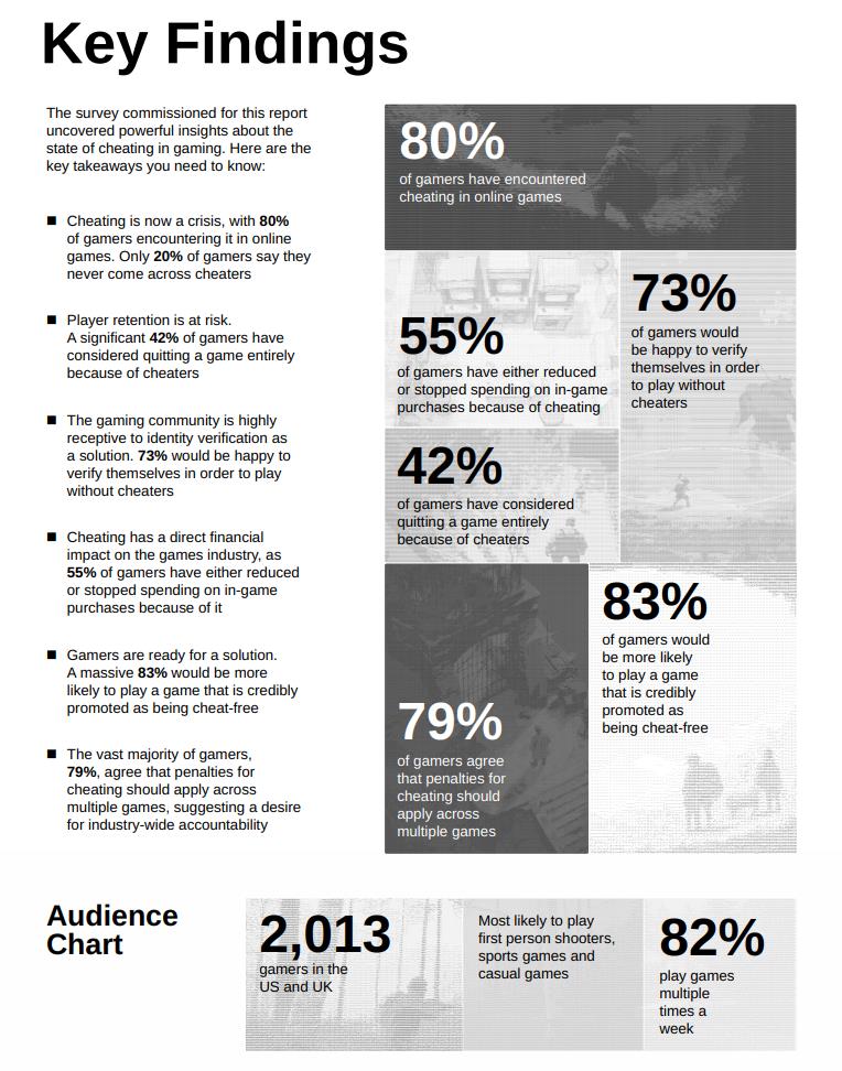 【调研数据显示80%玩家遇过挂,42%的用户因此放弃游戏】PlaySafe ID近日分享了一份有关“游戏作弊危害”的研究报告。该报告的数据来自对欧美地区2000多名玩家的调查,内容如下: