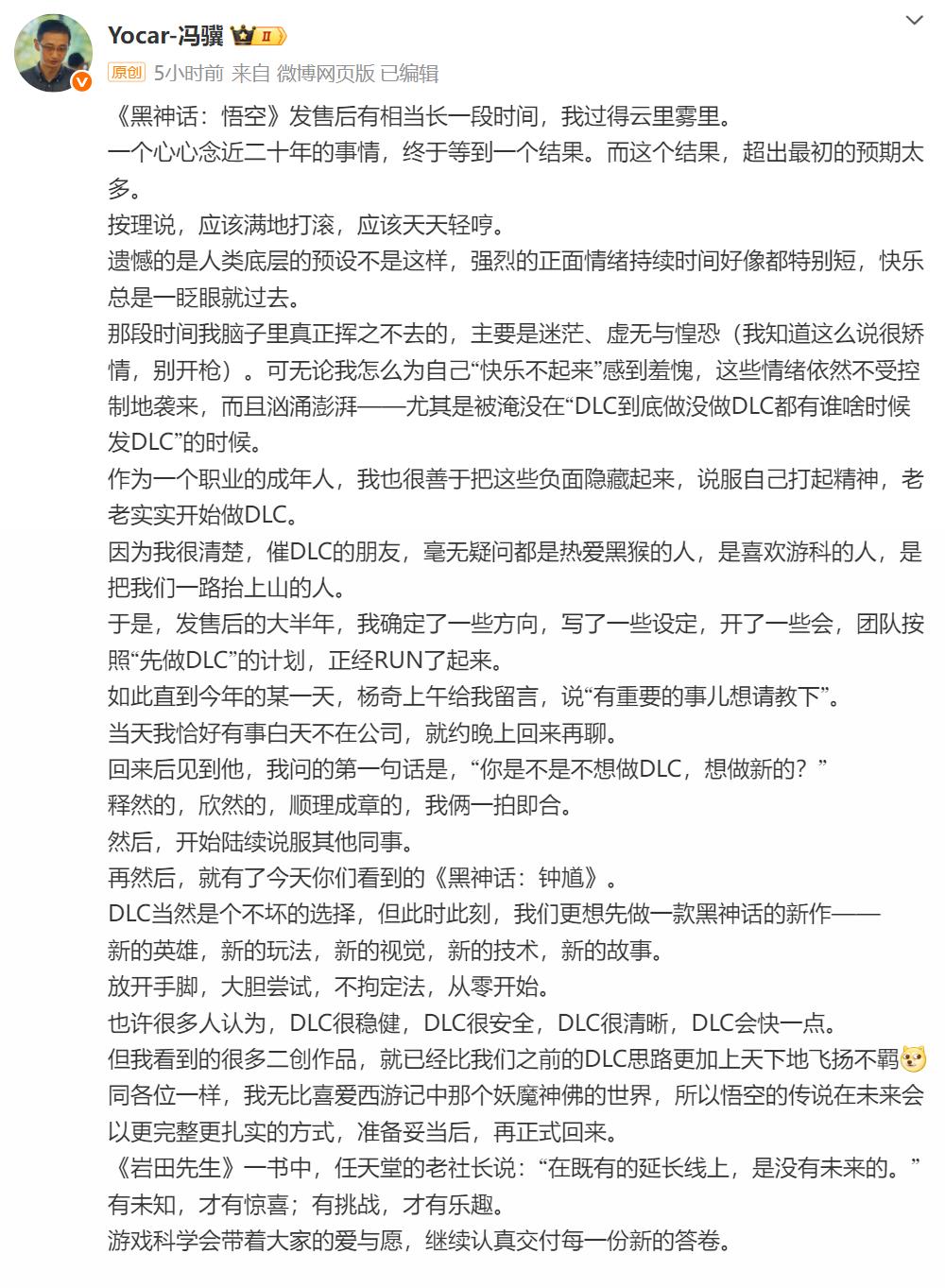此外,冯骥在微博上发文解释了何未出《黑神话:悟空》DLC以及本作的开发初衷。并表示悟空的传说会在未来以更完整、更扎实的方式归来(全文详见附图)。