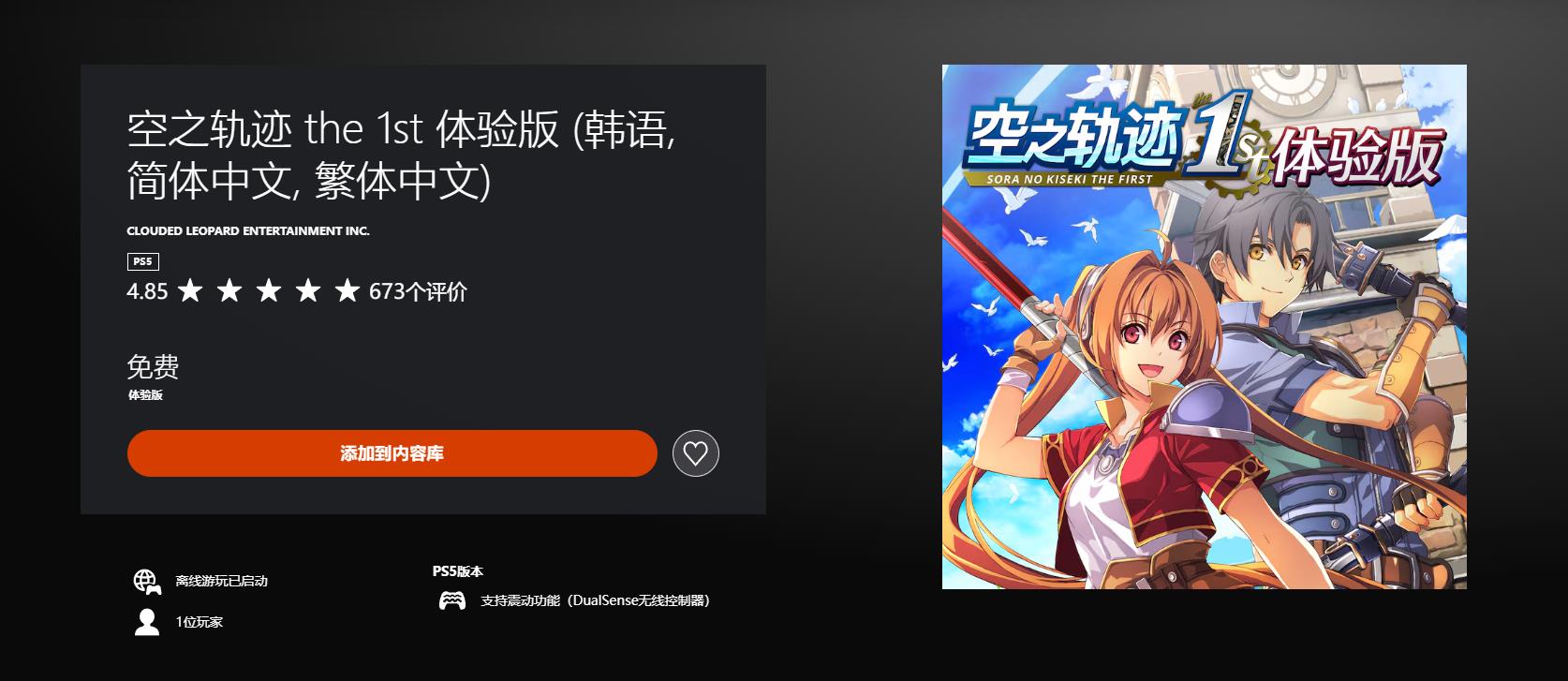 【《空之轨迹the 1st》体验版获玩家好评,PS商店评分4.85】《空之轨迹the 1st》体验版已于昨日上线NS/PS5/Steam平台,不少玩家和媒体试玩过后都给予积极的评价。截至目前,体验版在PS商店中已有673个评价,全球玩家评分4.85,其中五星好评率95%。