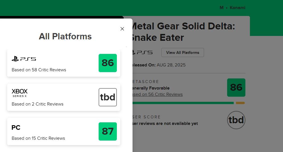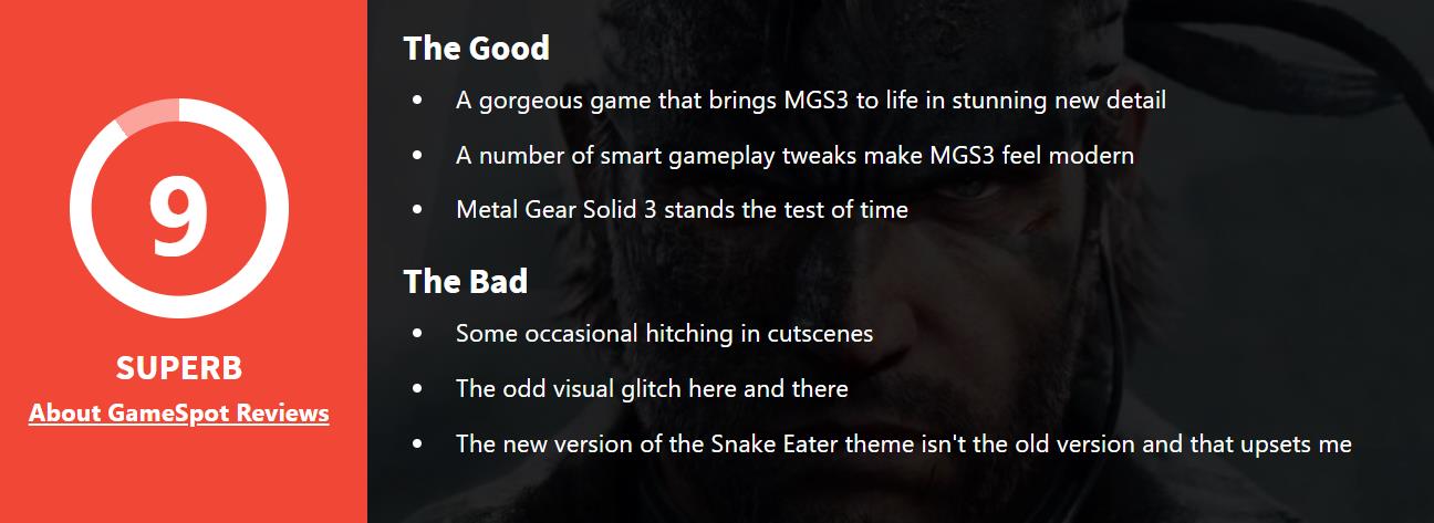 【《合金装备Δ:食蛇者》MC均分86,获IGN8分,GS9分评价】由Konami所带来的经典重制游戏《合金装备Δ:食蛇者》全球媒体评测现已解禁。截至目前游戏在MC上PS5版均分86(暂由58家媒体给出),PC版87分(暂由15家媒体给出)。其中IGN为本作打出8分,GameSpot则给出9分评价。