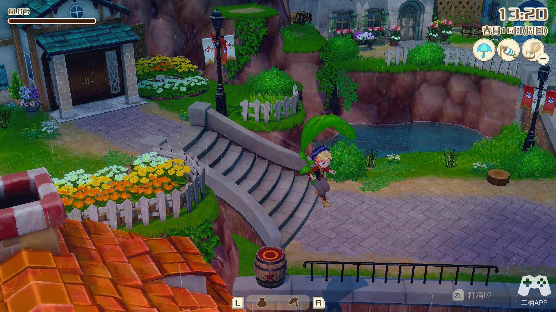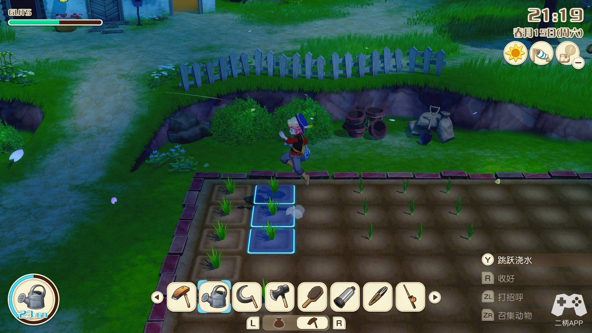 在《风之繁华集市》中,跳跃操作成了一个颇为有趣的机制。通过跳跃,玩家不仅可以跨越地形障碍,还能拓展农耕的操作范围。例如,站在一格的中心跳跃浇水,水流能覆盖三格;割草、播种同理。这使得跳跃成为提升效率的重要技巧。然而,跳跃本身会额外消耗体力,因此在高效与谨慎之间,玩家需要自己找到平衡点。这种微妙的“权衡感”恰恰是本作日常循环的魅力之一。