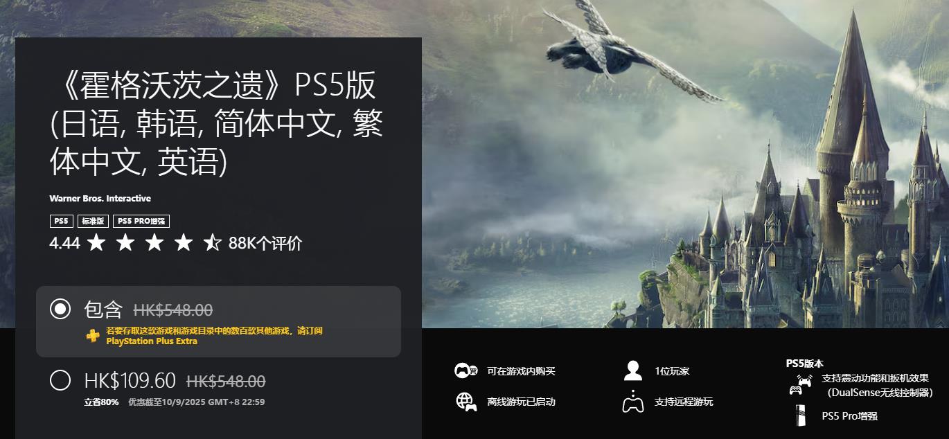 《霍格沃茨之遗》PS4/PS5版93.6/109.6HKD(新史低)
