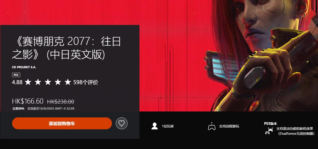 《赛博朋克2077:往日之影》166.6HKD(平史低)等