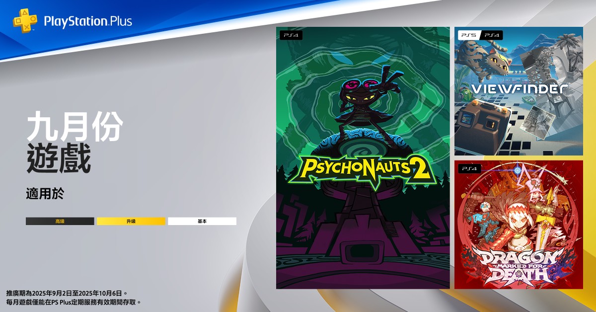【9月份PS+HK商店会免游戏公布】PSN HK地区商店2025年9月份PS+会免游戏名单现已出炉,其中欧美地区的《星露谷物语》换成了2D横版动作游戏《龙之死印》。具体如下: PS4《脑航员2》 PS4《龙之死印》 PS4/PS5《Viewfinder》 领取时间为2025年9月2日~2025年10月6日