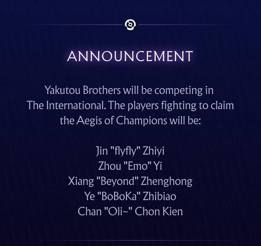 【中国战队+1!YB将顶替GG参加今年的《Dota2》国际邀请赛】因GG战队管理层和选手不合选择退赛,V社宣布中国战队YB将作为替补参加今年的国际邀请赛。同时YB战队的全称也从Yakult Brothers更名为Yakutou Brothers。