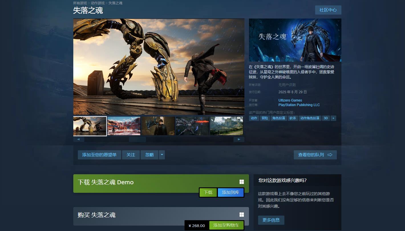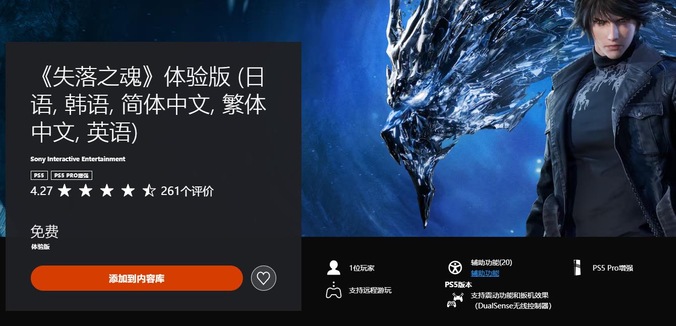【《失落之魂》现已发售,试玩版现上线PS5和Steam】动作角色扮演游戏《失落之魂》试玩版现已在PS5和Steam平台上线。其中PS5版大小约38.36GB,Steam版36.01GB。此次试玩内含游戏中精选的战斗关卡,玩家可尝试不同的能力与武器,迎接富有挑战性的Boss战并亲自上手感受畅快战斗。《失落之魂》现已在PS5和PC上正式发售,试玩版存档无法在正式版中继承。