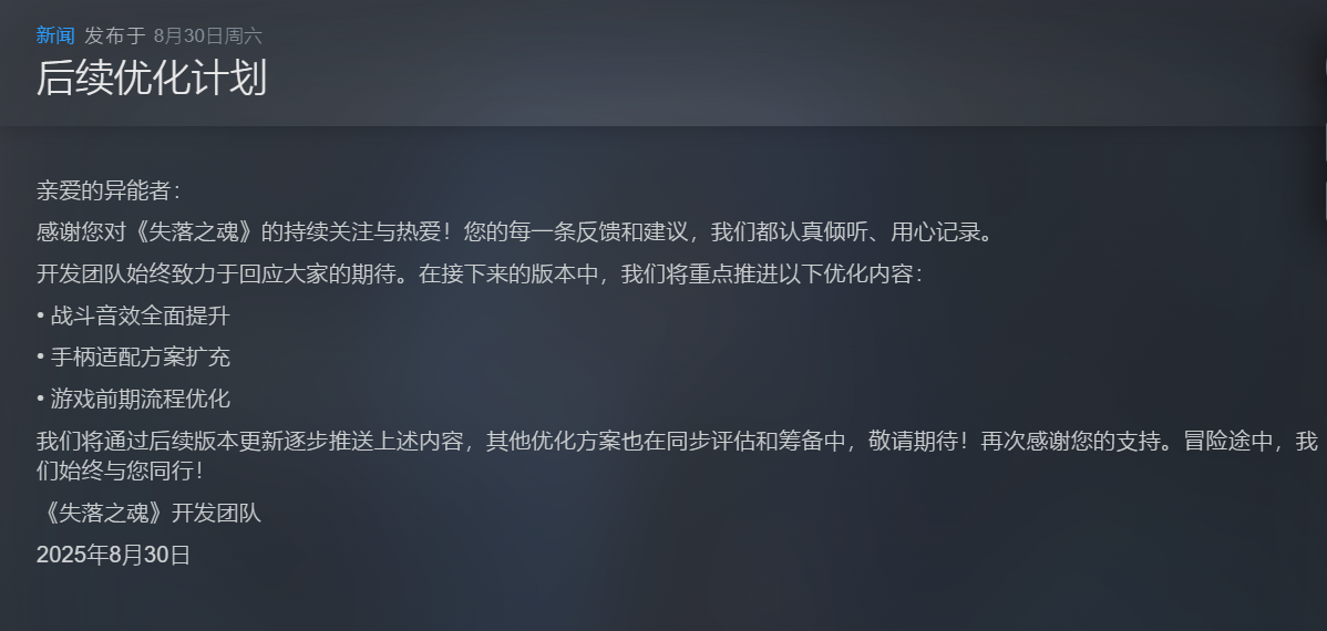 《失落之魂》后续优化计划公开,着重解决音效和手柄等问题