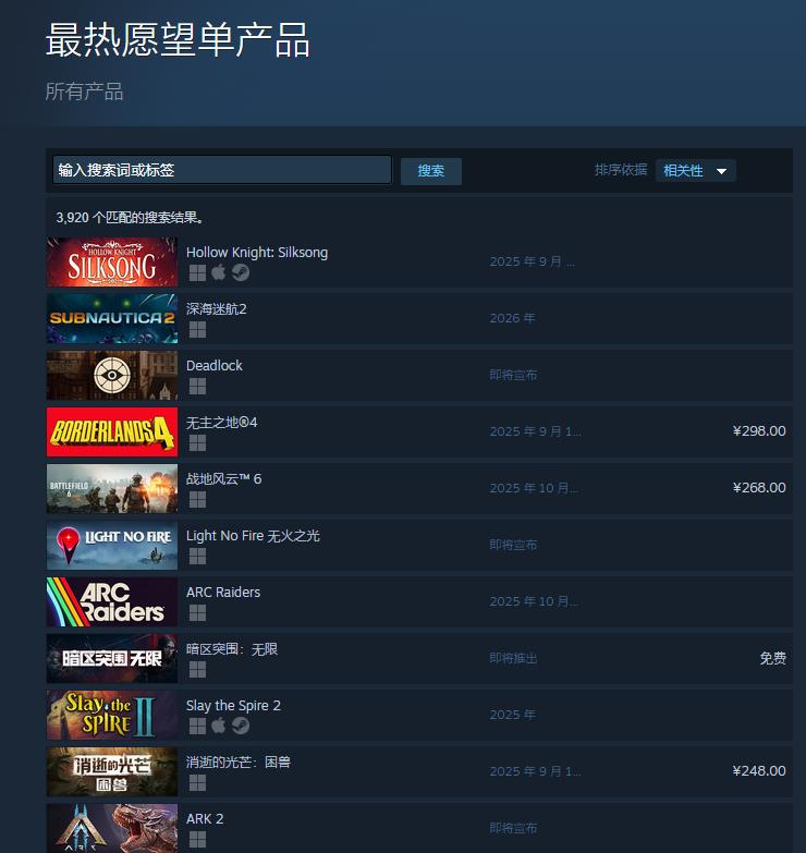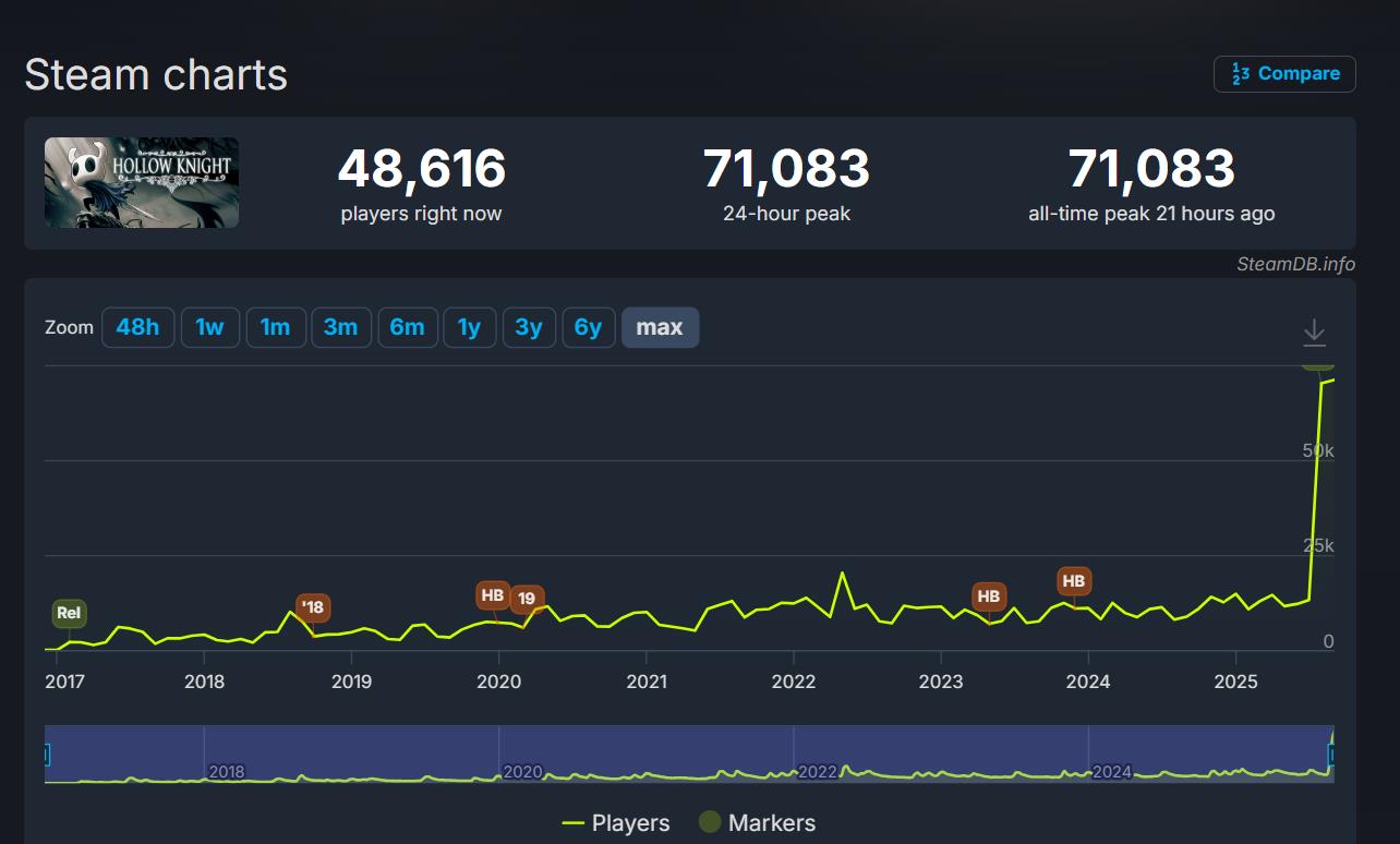 【“空洞”热潮来袭!《丝之歌》登顶Steam愿望单,前作峰值数创新高】《空洞骑士:丝之歌》即将于9月4日22:00正式上线!作为一款玩家翘首以盼多年的续作,本作自然也登上了Steam最热愿望榜单首位。不仅如此,前作《空洞骑士》热度也随之飙升。游戏近期Steam玩家峰值达到7.1万,远超2022年5月创下的2万人纪录。《空洞骑士:丝之歌》登将登陆NS/NS2/PS4/PS5/Xbox Series/Xbox One/Steam平台,首发Game Pass。