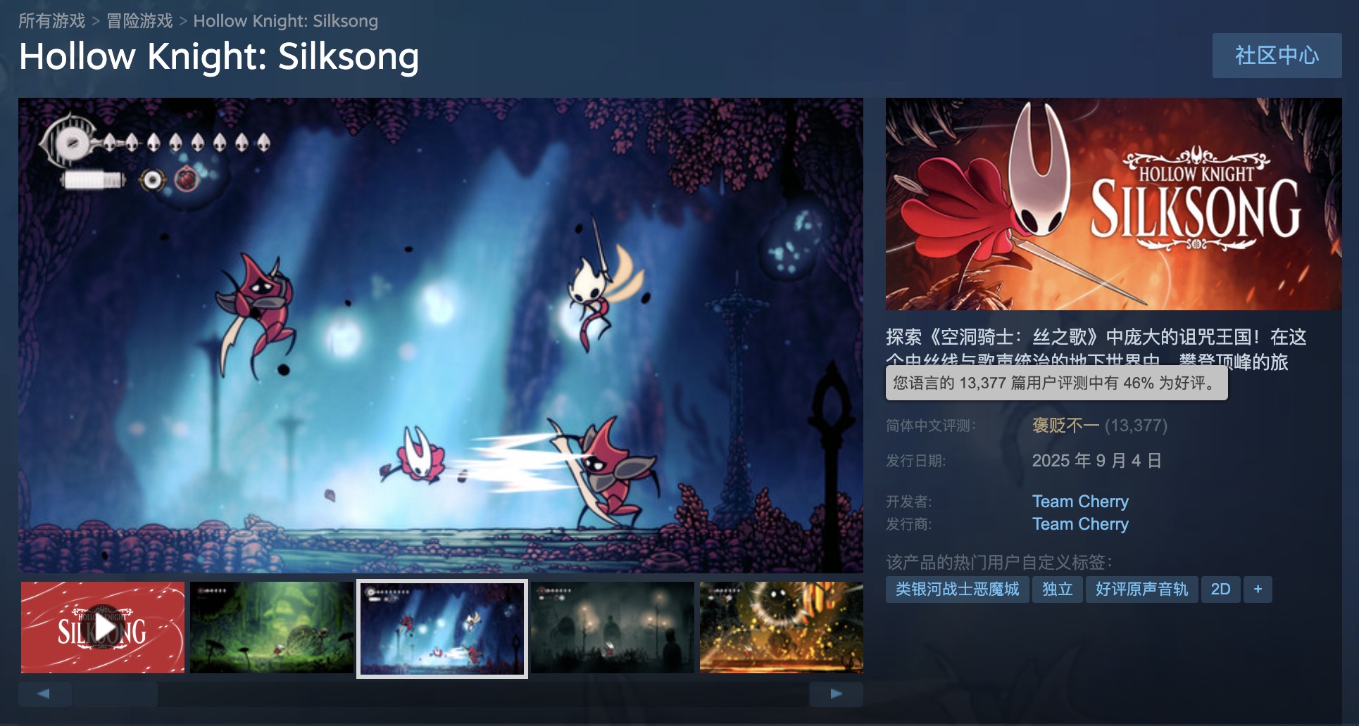 《空洞骑士:丝之歌》Steam简中好评率跌至46%